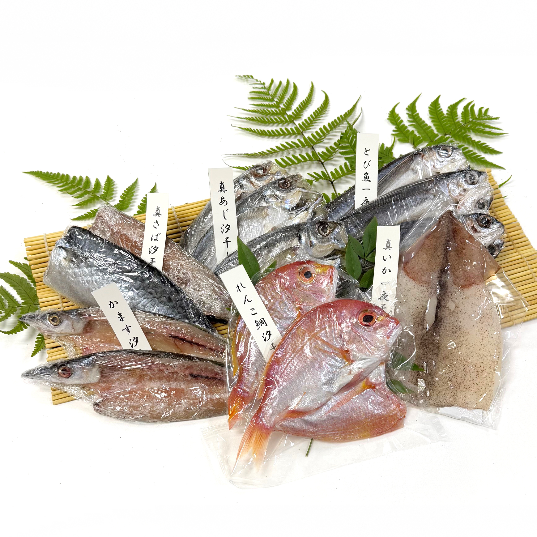 とび魚一夜干し・真あじ汐干し・真あじ桜干し・かます汐干し・真いわし桜干し・れんこ鯛汐干し・真さば汐干しなど旬の鮮魚を干物にした6~8点セットをお届けします。(※真いかは時期や水揚げによって含まれない場合がございます)